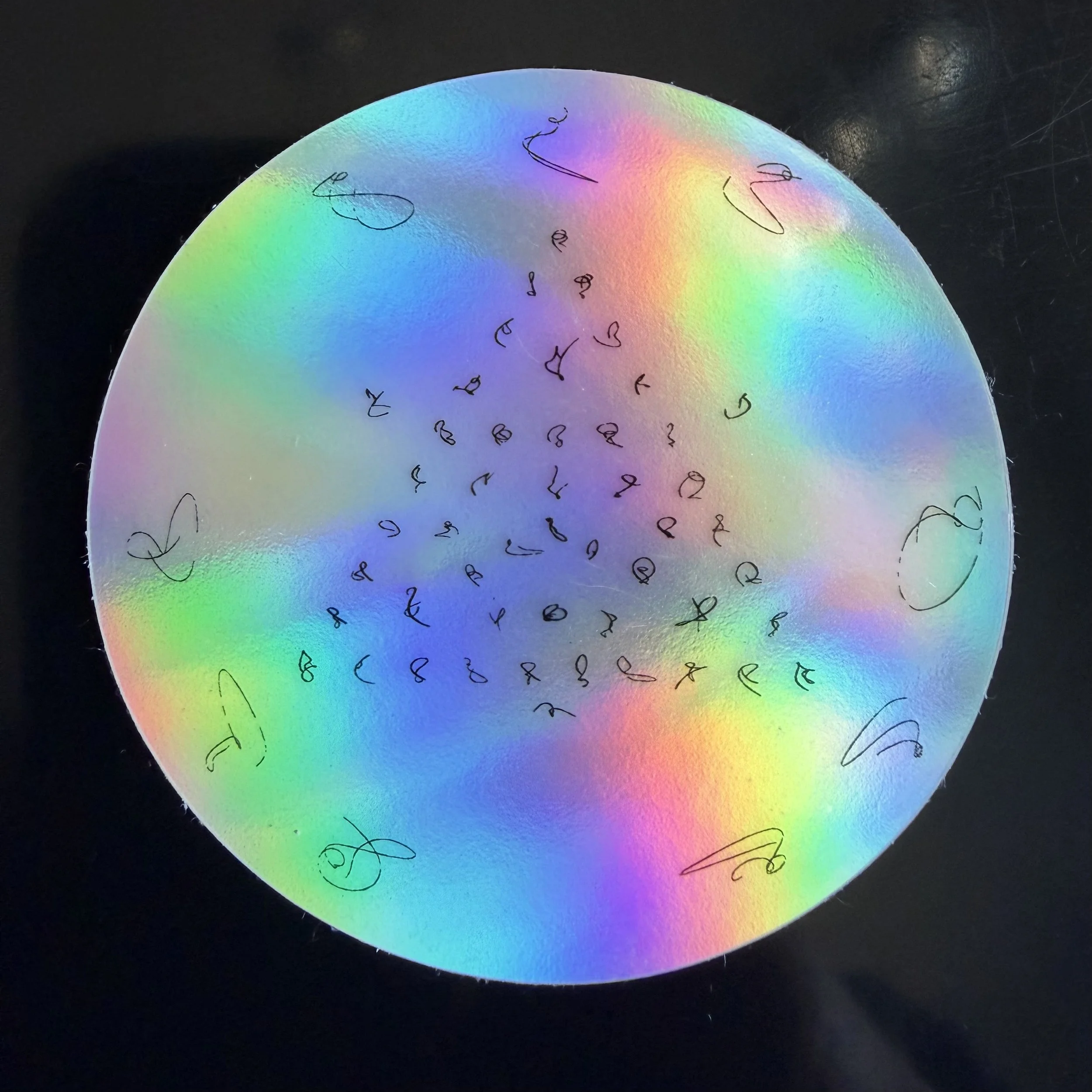 The circular stickers are printed on holographic paper - on a metalic polypropylene coating only 40 microns thick and a clear gloss laminate only 20 microns thick with a paper backing. This makes them very durable and waterproof, and because of their thinness with an absolute minimum of polypropylene.