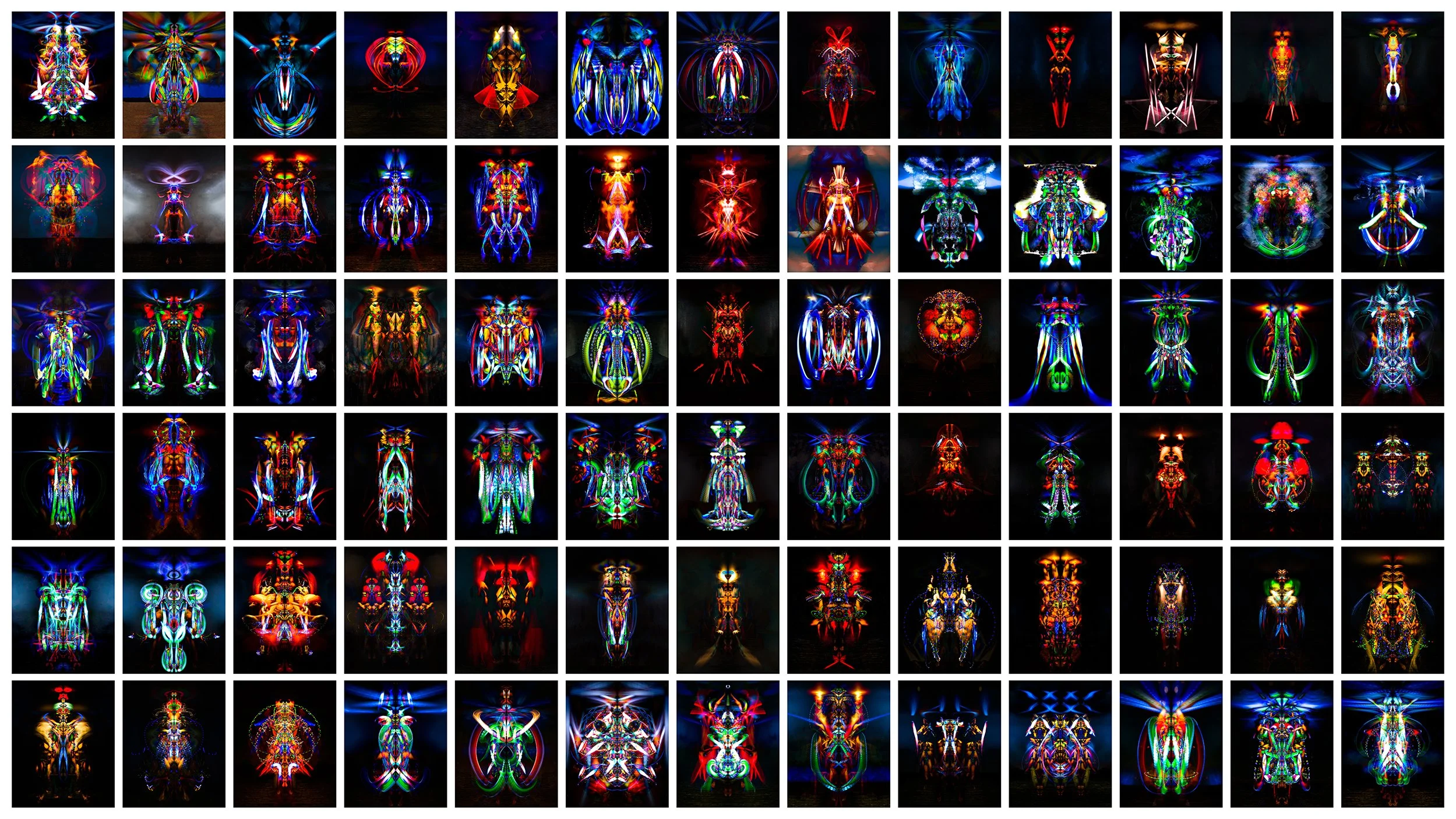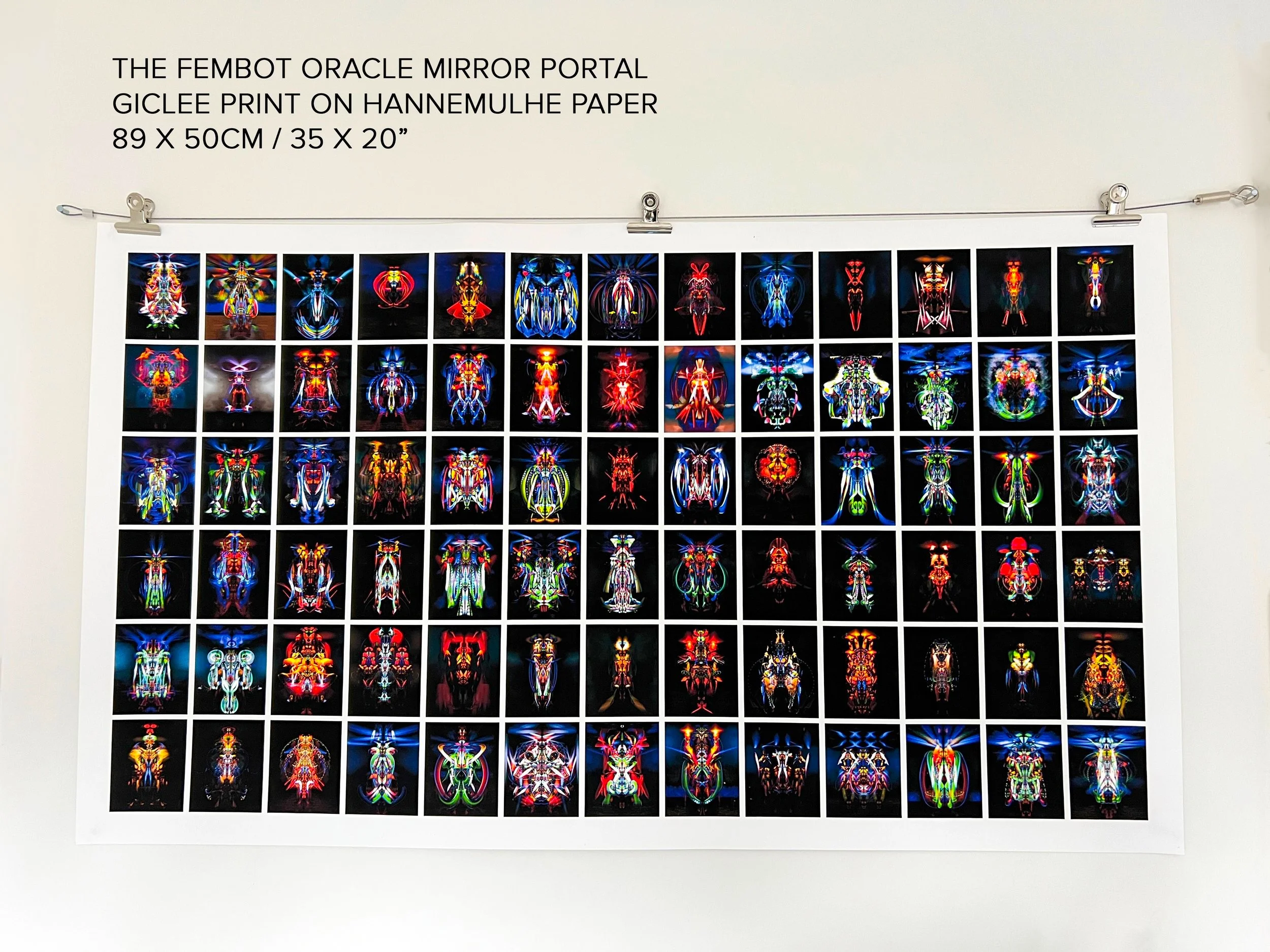 The Fembot Oracle Mirror Portal is a print of all 78 Fembot oracle images in a 13-column grid. It adaptogenically infuses your space with the essence and energy of the full collection of these 78 Art Alchemy archetypes.